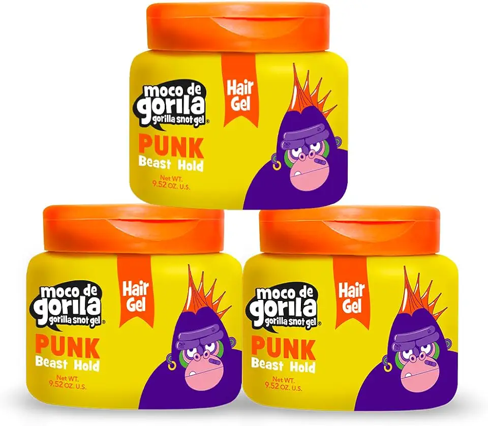 Moco de Gorila Punk Gel 3-Pack (3 x 11.99 oz squeeze bottles, 3.5 lbs total). Extreme hold, water-reactivatable, no flake. For punk & strong styles. 1-year warranty.